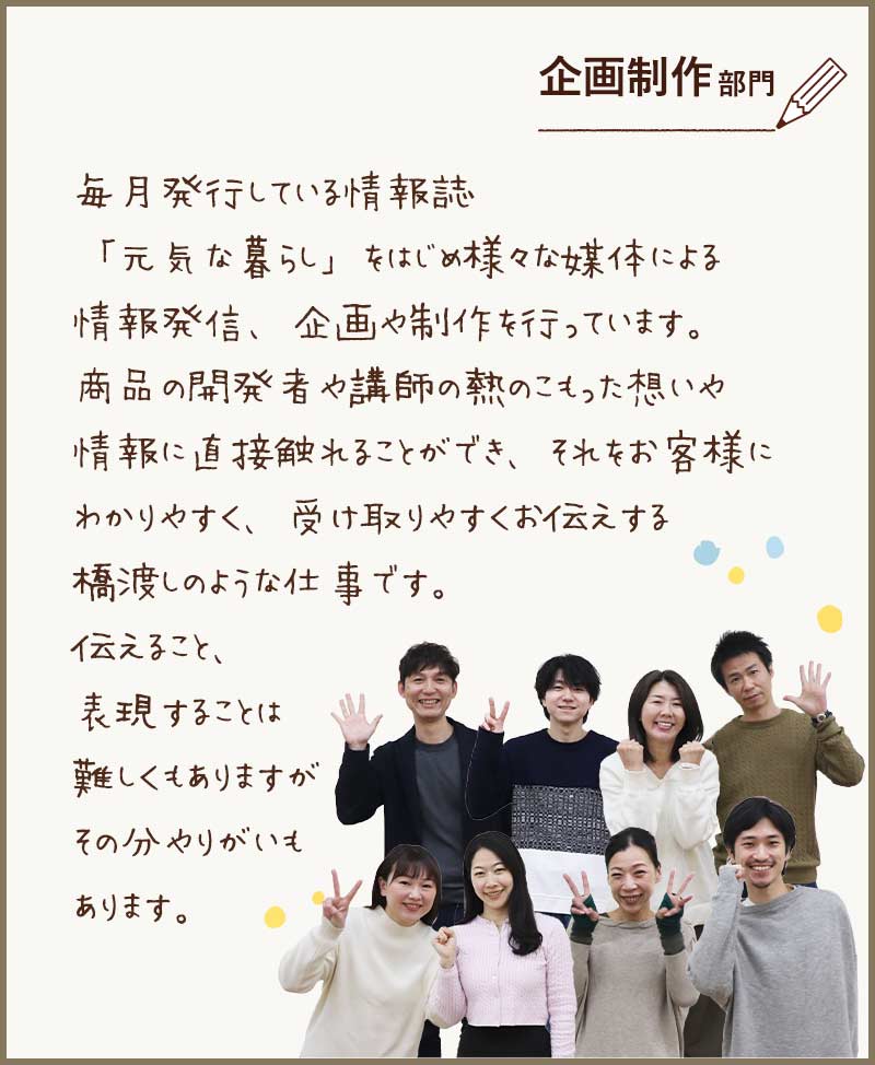 一人ひとりが個性を発揮できる社風ですので、自分のやりたいことをイキイキワクワクしながら見つけていこうという人なら、楽しく働ける会社です。